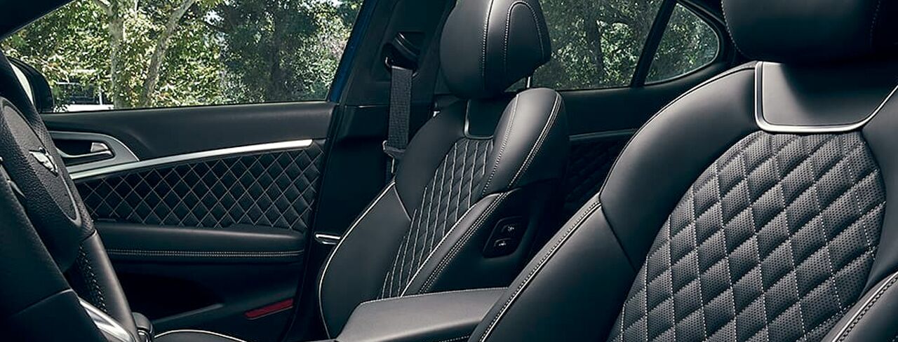The driver-centric cabin experience is enhanced by available Nappa leather seats, adorned with a unique diamond quilting pattern, a striking feature further highlighted with contrast stitching.